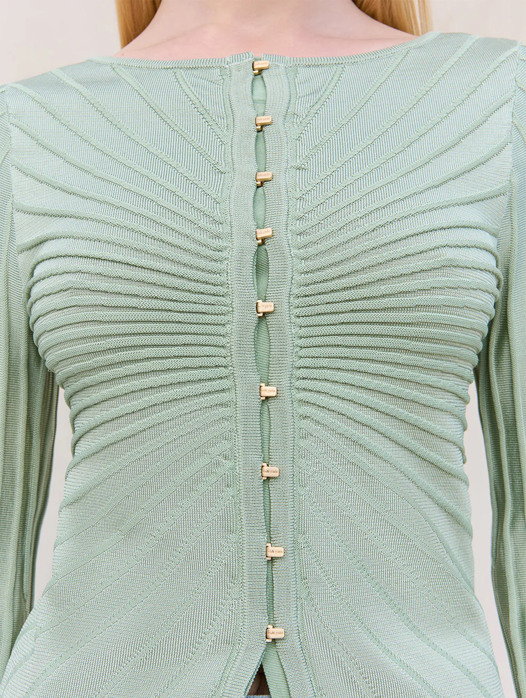 A classic elevated to an elegant tier, the Aine Knit Cardigan from Cult Gaia is a simple upper with transformative detailing. Crafted from a radial stitch ribbed knit with gold hardware hook and eye closure that allows for adjustable coverage depending on the occasion. Perfect for transseasonal styling, pair with silk trousers or denim all year round.