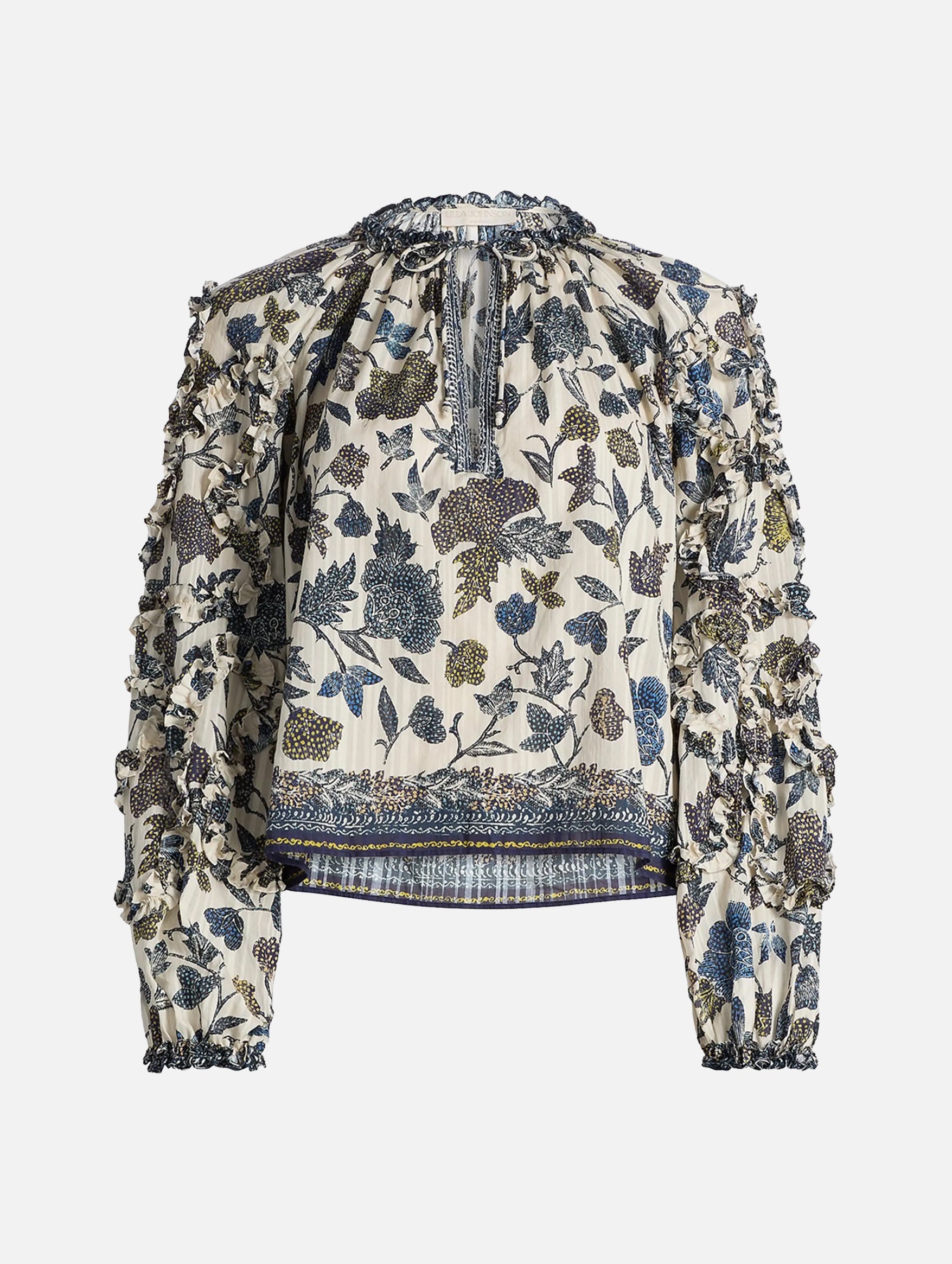 Softly modern, effortlessly feminine, the Azrou Cotton Long Sleeve Blouse melds relaxed ease with refined detail. Crafted in fine cotton-blend with subtle shadow-stripe texture, it drapes in a fluid silhouette, its V-neckline with optional ties lending a hint of bohemian ease. Long sleeves with elastic cuffs, plus a lightweight, voluminous fit, make it ideal for styling tucked into high-waisted trousers or loosely over denim.