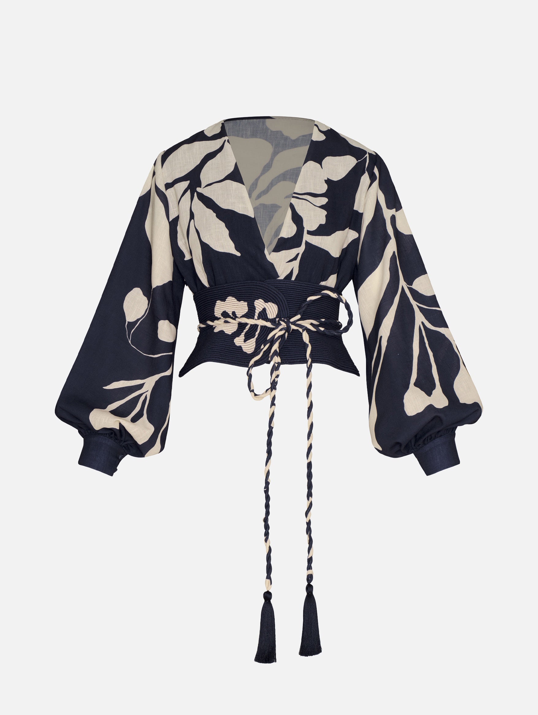 Crafted from crisp linen, the La Postale Belted Linen Balloon-Sleeve Top from Andres Otalora is a versatile piece for your next getaway. This piece is a dance of elegance and exuberance, featuring a navy botanical print to whisk you away on your next adventure this season. Pair with the coordinating Preferida Trousers for an effortlessly chic ensemble.