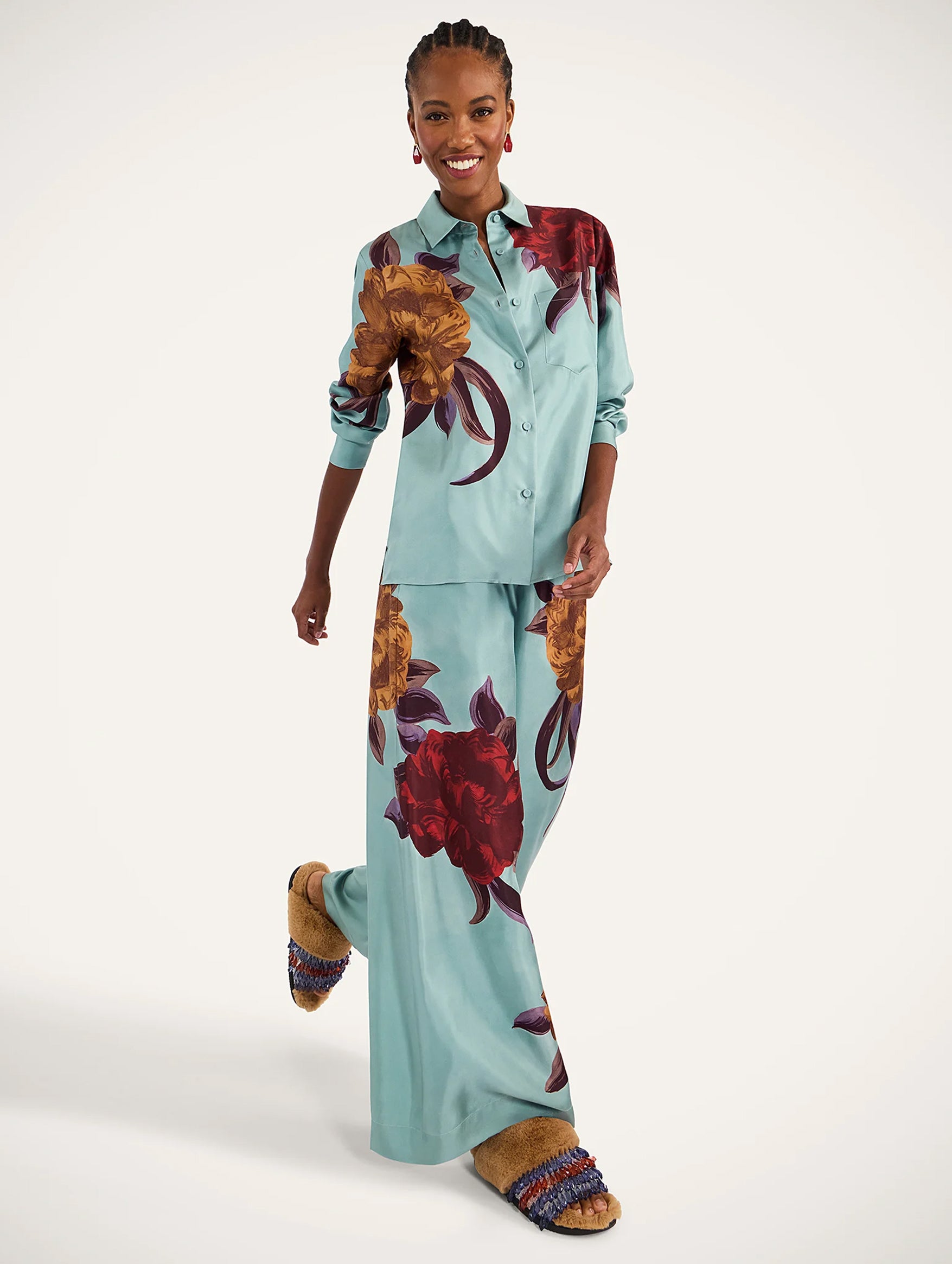 The La DoubleJ Palazzo Pants in Peony Placée Light Blue blend refined tailoring with carefree summer elegance. Crafted from fluid silk twill, these high-waisted pants float with ease thanks to wide legs and a softly structured waist. The delicate peony print lends a painterly charm, while the versatile cut makes them effortlessly transition from relaxed brunch to evening sophistication. Pair with the coordinating Boy Shirt for an amazing vacation ensemble.