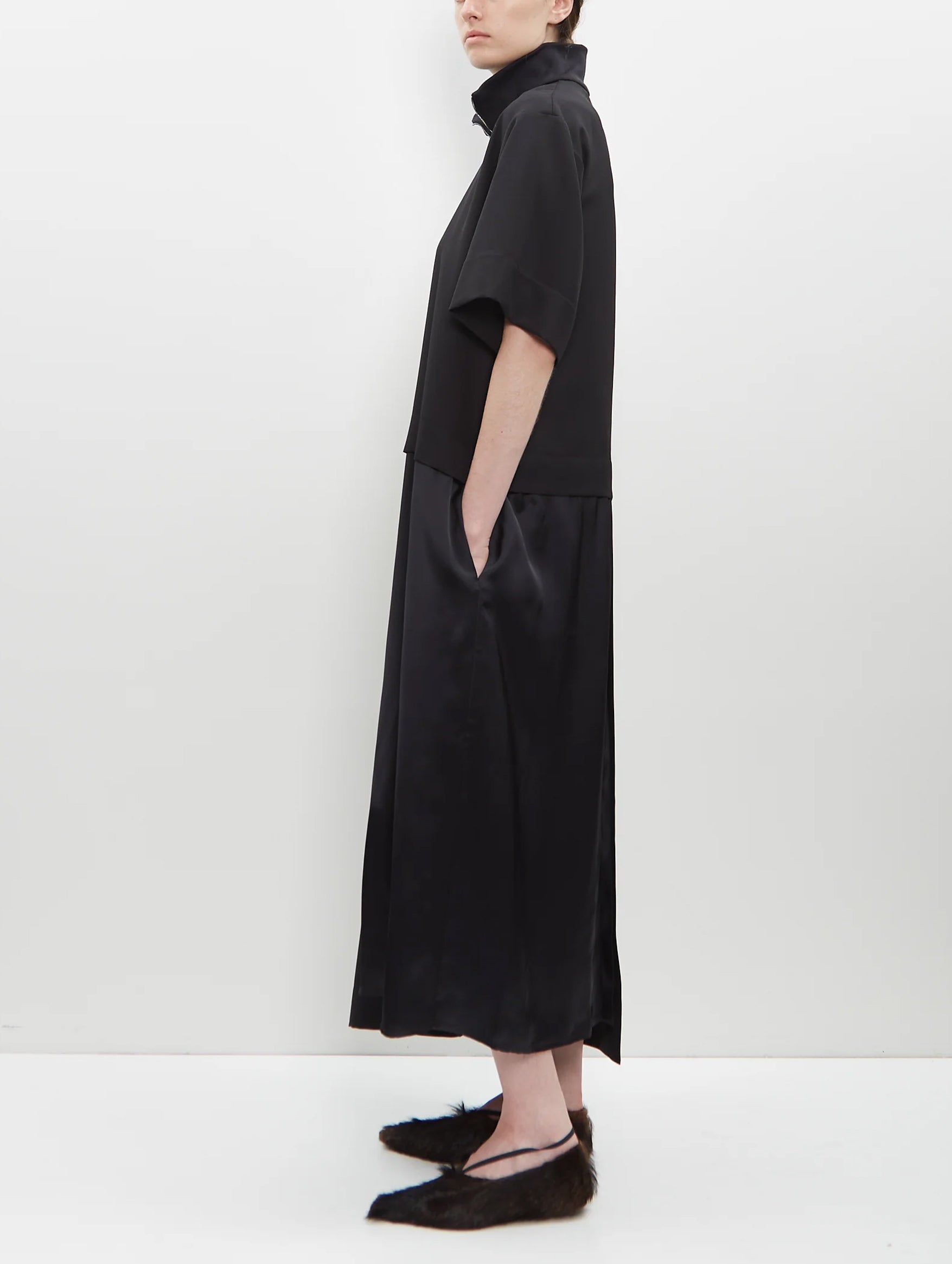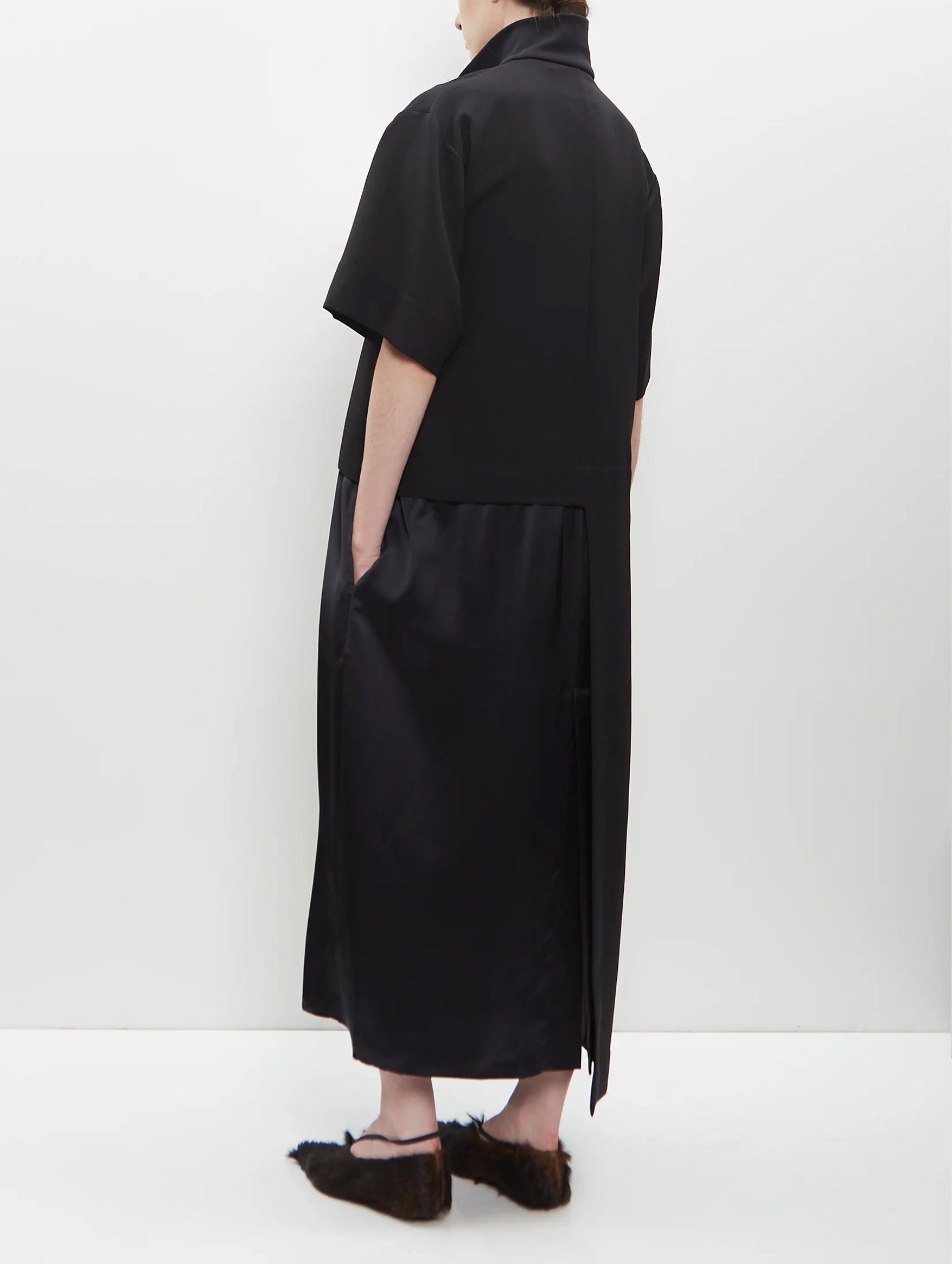 A staple in your season-less wardrobe, the Zippered Asymmetric Midi Dress from Plan C is simple in construction and elevated in design. Featuring a classic shirt silhouette with a high stand ribbed collar, a quarter-zip closure, side seam pockets, with contrasting satin fabric in wool to add interest. Style with everything from boots to heels all year round.